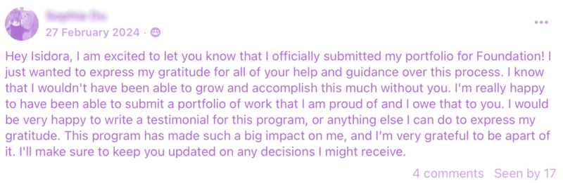 You’ll learn exactly what top schools look for and follow a clear, step-by-step plan to get there. With personalised feedback and continuous support, you’ll stay focused, accountable, and creatively energised.